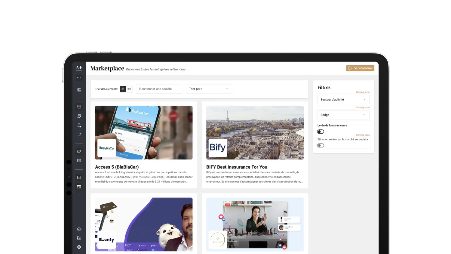 La plateforme Access Equity offre une place de marché secondaire qui présente les sociétés listées et référence les offres de titres.