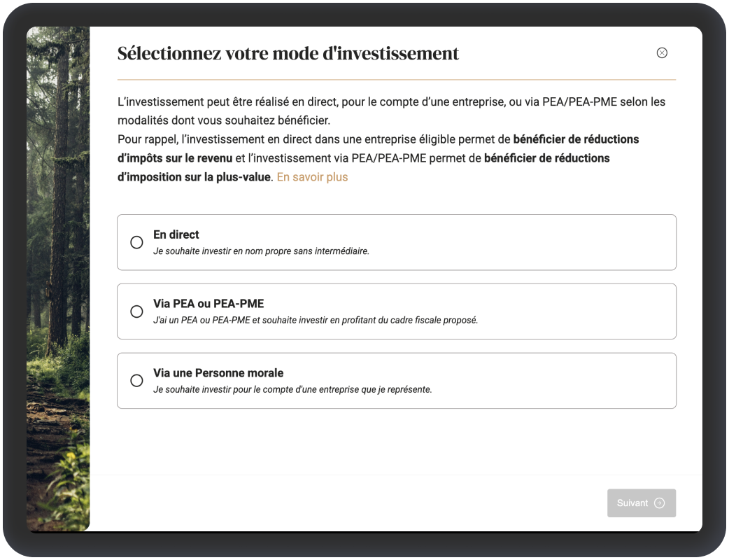 Notre plateforme offre aux investisseurs un parcours de souscription fluide et sécurisé, de la déclaration d’intention via un formulaire optimisé à la signature électronique des documents légaux. Vous pouvez suivre en temps réel l’avancement de chaque investisseur de l’intention à la signature et maximiser la conversion des engagements.