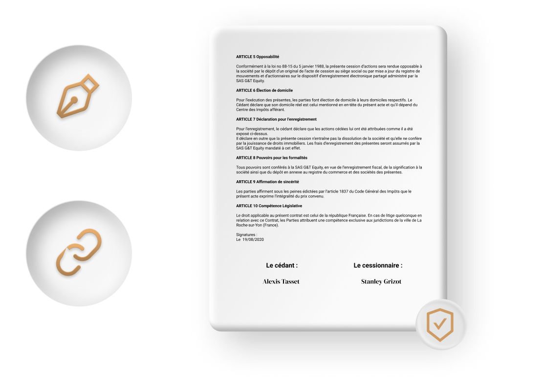 Il est possible d’utiliser un acte de cession standard ou un contrat spécifique rédigé par votre partenaire juridique.
