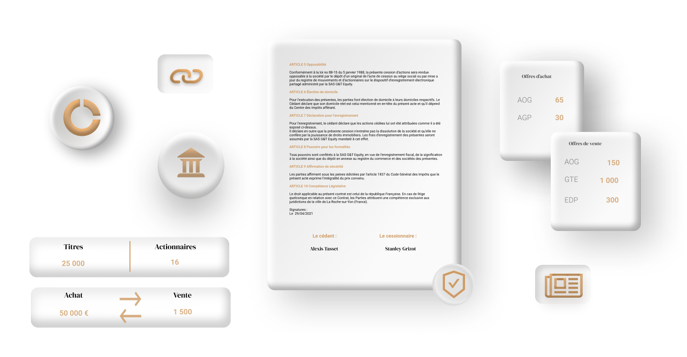 Le transfert des fonds et des titres est géré par l’application. L'ensemble des documents légaux sont générés et signés en ligne afin d'assurer la bonne conduite de la transaction, que la contrepartie ait été trouvée sur la plateforme ou en dehors.