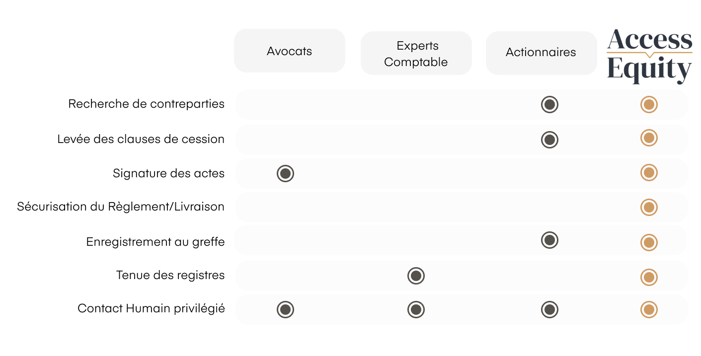 La solution Access Equity permet de faire se rencontrer les acheteurs et les vendeurs d'actions non cotées. Les vendeurs peuvent trouver de la liquidité pour leurs investissements passés et contractualiser de manière totalement dématérialisée.